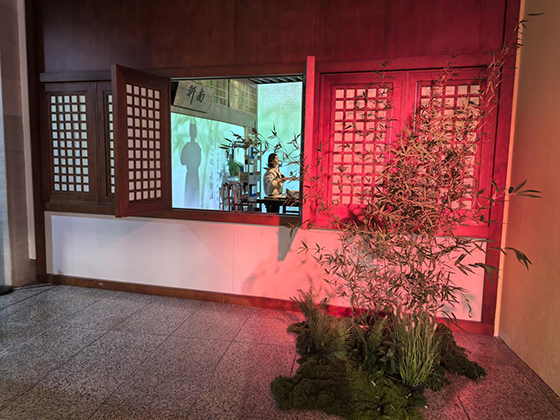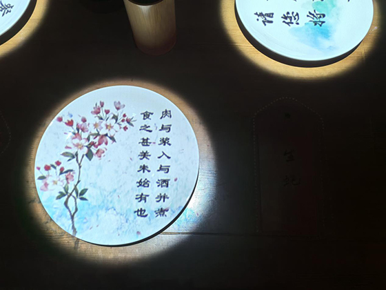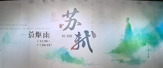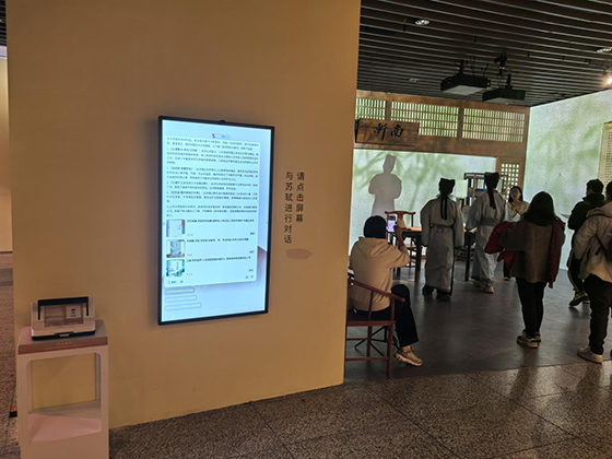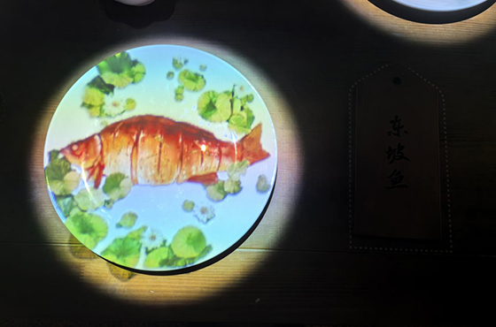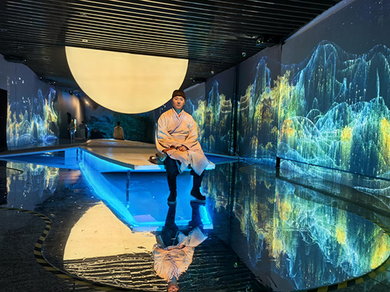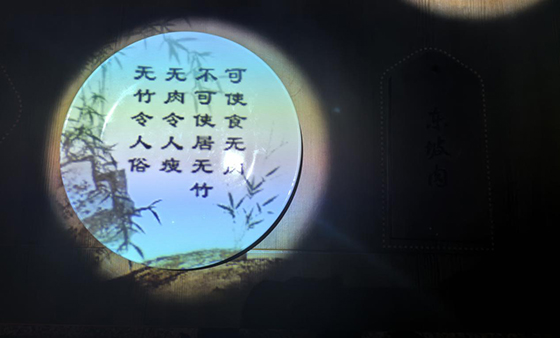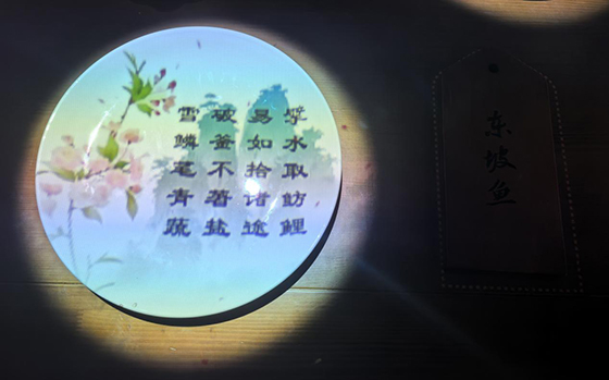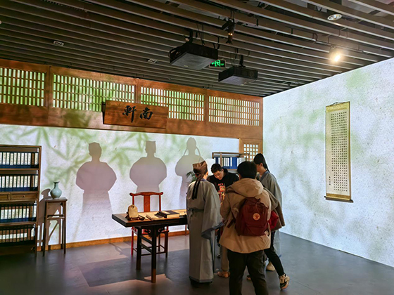 《一蓑煙雨》展內不僅應用了40余臺投影機作為主體光影內容的呈現,還能配合實體造景、大屏互動、印章打卡、古風NPC駐場等形式打造出風味濃郁的“蘇軾空間”。