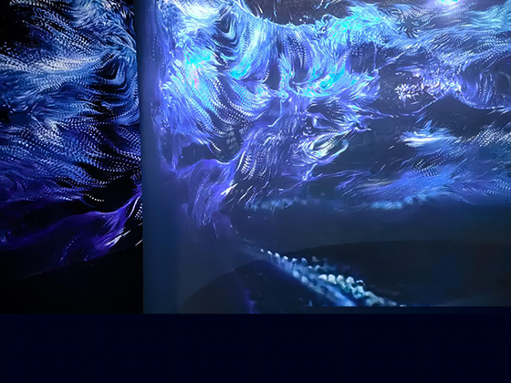 借助程序生成實時影像,這種“一眼萬年”的能量波動在光影中得到詮釋,自然永恒的生命力與涅槃重生的巨大能量被影像描述為“從壯麗山川到熱烈跳動的流光溢彩,最后歸于平和,化為幽深卻和煦的猶如山川般沉穩的深藍”。此時,這一物理空間不覺間已被影像轉化為情感交互的場域,更重塑著當代藝術的表達維度。