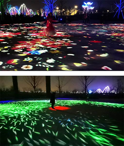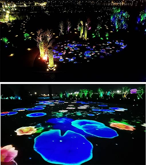 夜幕下,地面上的海棠花朵不斷飄落變幻,活潑的游魚在蓮葉見忽隱忽現,魚群在影像追蹤系統的作用下與游客相互追逐,一個如夢似幻的“島中花海”躍然呈現在游客腳下。