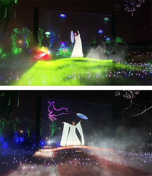 全息紗幕投影名為“湖中仙境”,每個紗幕投影面積為4m×6m,分別位于龍橋的兩側。紗幕上,白衣仙子持傘起舞,花朵、神鹿縈繞左右,在燈光,霧氣,以及海棠花林的襯托下,兩扇紗幕紛紛化作兩位真正的花仙,將人們引入海棠花的世界。