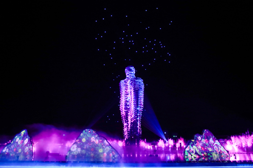 微笑廣場(chǎng)的核心景觀——18米高的大型不銹鋼動(dòng)態(tài)雕塑,是格魯吉亞著名雕塑家塔瑪拉首個(gè)落戶中國(guó)的作品。該雕塑隨著演出的進(jìn)行拆分組合,在一個(gè)整體的大型人體雕塑和多個(gè)獨(dú)立雕塑之間來(lái)回變換,不銹鋼雕塑在投影機(jī)的投射下變得流光溢彩,熠熠生輝,畫(huà)面上出現(xiàn)的古典文化元素與現(xiàn)代概念雕塑相結(jié)合,共同成就了這場(chǎng)美輪美奐的表演。