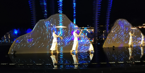 圍繞著雕塑分布著十座小山造型紗幕裝置,紗幕上水鄉(xiāng)建筑、錦鯉荷塘、修竹彩霞等景象,伴隨著舞者曼妙的舞姿輪番上映,為整場(chǎng)演出營(yíng)造出迷幻絢麗又極具拈花灣特色的氛圍;在雕塑所處的廣場(chǎng)上設(shè)置了噴泉和表演水臺(tái),當(dāng)演出者在水臺(tái)上表演時(shí),水臺(tái)上的投影便會(huì)營(yíng)造出“水上行走”的夢(mèng)幻效果。