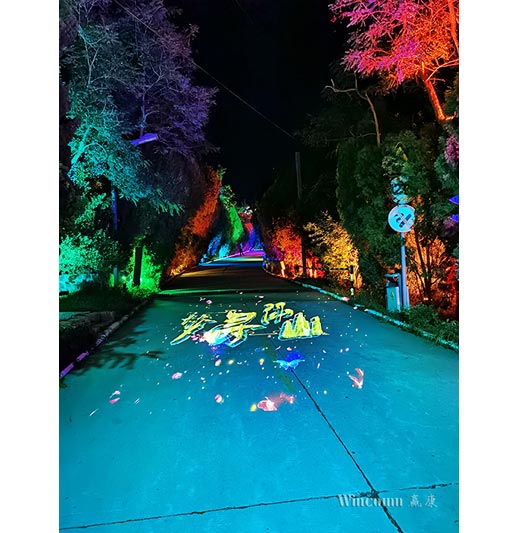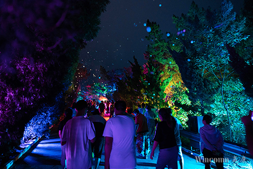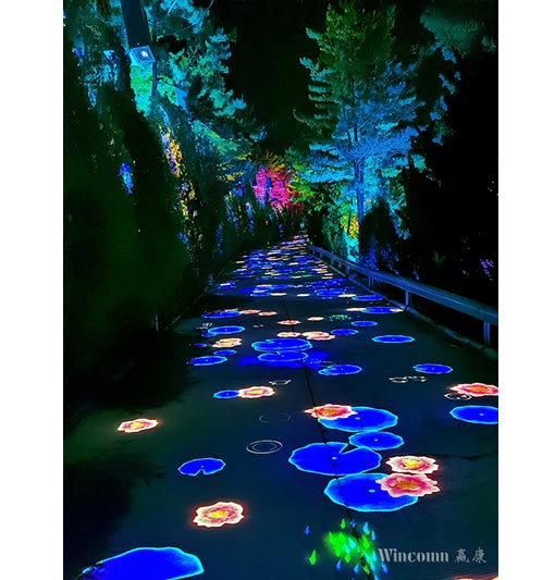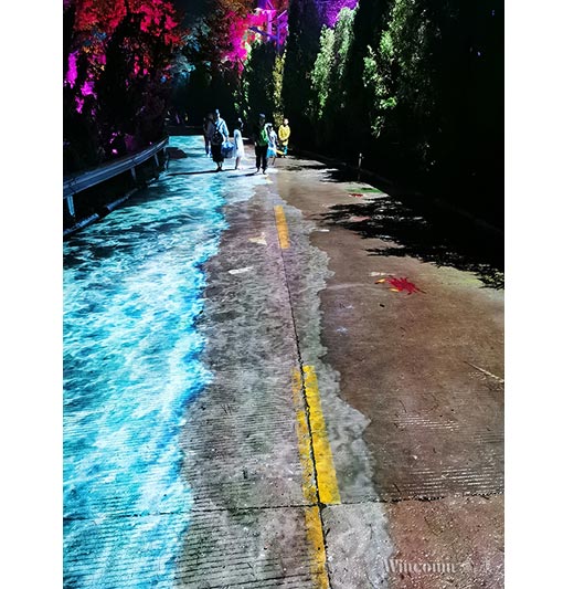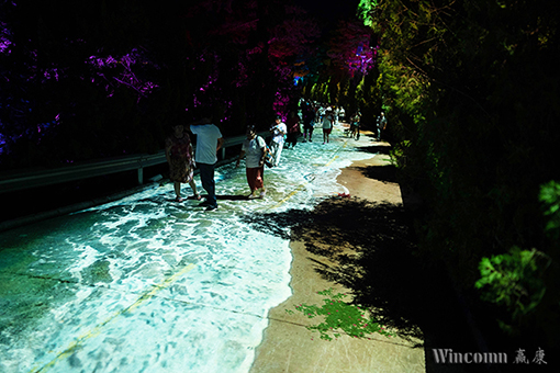 該夜游還設計了一處100米長的林間地面互動走廊。走廊兩側茂密的樹林被燈光渲染上各種不同色彩,地面上是通過投影機呈現的海浪、沙灘、花海、游魚等畫面,在影像追蹤系統的作用下,游魚與游客相互追逐,趣味十足。