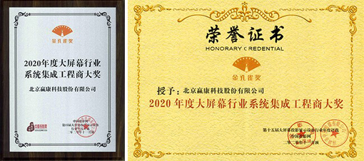 2020年11月26日,由中國投影網與中國視聽網、數字標牌網、音響網四網聯合舉辦的視聽行業高峰論壇——暨"中國大屏幕投影行業2020年度評選"在深圳灣科技生態園開幕。經過專家組、評委組、網上投票等多種方式層層篩選,贏康科技榮獲“2020年度優秀案例”與“2020年度大屏幕行業系統集成工程商”兩項大獎。