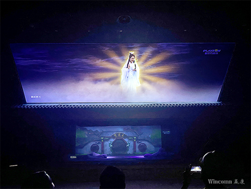 為了讓劇場演出更加符合《西游記》小說的傳奇色彩,還原精彩的“斗法”情節,劇場采用了上下幕結合、幻影成像、演員互動演繹的形式。劇場投影場景共分為三個部分,分別是主舞臺上方的天幕,舞臺中間的幻影成像,以及舞臺后方的場景切換投影區域。
