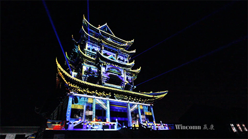 縉福樓投影秀是古城演出的重中之重,贏康協助浙江燈光總包公司共同完成了縉福樓光影秀,負責投影秀媒體片源制作和投影系統設計實施工作。