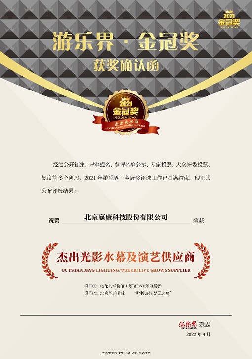 “游樂界·金冠獎”評選活動正式落下帷幕,經過專家投票、大眾評委投票、復議等多個階段,贏康科技憑借“;◢u博物館4號館360°環幕投影”與“北京環球影城——“‘哈利波特·禁忌之旅’”兩個項目,獲得了杰出光影水幕及演藝供應商大獎。