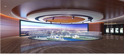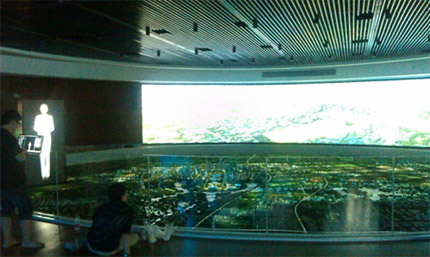 該系統(tǒng)采用4臺(tái)松下PT-FDX91CK+變焦鏡頭ET-DLE150,運(yùn)用半球幕多通道投影方式,配合具有未來感的駕駛艙設(shè)計(jì),通過虛擬漫游的方式向觀眾展現(xiàn)海創(chuàng)園概覽、西溪濕地等極具賣點(diǎn)的優(yōu)勢(shì)。創(chuàng)業(yè)、工作、生活氛圍都將通過體感虛擬漫游與參觀者進(jìn)行互動(dòng),將海創(chuàng)園的優(yōu)勢(shì)放大,讓人們?cè)谟螒虻耐瑫r(shí)加深對(duì)海創(chuàng)園的印象。同時(shí),更可貴的是具有3I特性——沉浸感、交互性和構(gòu)想性,使得沿用固定漫游路徑等手段的其他漫游技術(shù)和系統(tǒng)無法與之相比,能使用戶具有身臨其境的沉浸感。