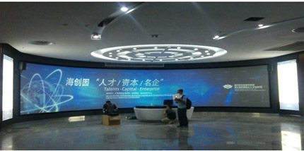 該區(qū)是由一塊大型弧形幕及數(shù)字沙盤組成,采用5臺(tái)10000流明松下PT-FDX110C和20臺(tái)8200流明松下PT-FDX91CK,多臺(tái)單芯片DLP工程投影機(jī)在多種投射方式下融合校正成為其一大特點(diǎn)。為克服復(fù)雜的安裝環(huán)境對(duì)光路的阻礙,安恒技術(shù)團(tuán)隊(duì)特別配合長焦鏡頭ET-DLE350C及0.8短焦鏡頭ET-DLE055C來使用,使投影畫面準(zhǔn)確、清晰投射至成像屏幕。同時(shí)還運(yùn)用一臺(tái)PT-FDX91CK+變焦鏡頭ET-DLE080C設(shè)計(jì)全息投影虛擬講解員,將觀者帶入栩栩如生的參觀氛圍,讓觀眾置身于流光飛舞的現(xiàn)實(shí),在有限的時(shí)空內(nèi)加深了對(duì)區(qū)域的了解,對(duì)未來的海創(chuàng)園有了一個(gè)完美的印象,并沉浸于高科技演示帶來的藝術(shù)享受之中。
