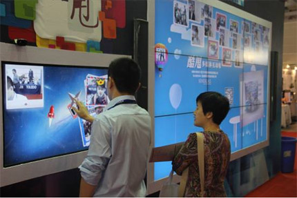 由DONVIEW拼接屏展示了一面叫做“酷甩”的多媒體互動墻,吸引了眾多參展觀眾,這是由3*3拼接屏實現(xiàn)的一個較大空間的案例顯示墻,同時與SI合作,建立了一個互動程序,用戶可以在觸摸屏幕前進行拍照,并將照片“甩”至大屏幕并與大屏幕上的其他照片及廣告元素進行互動。“酷甩”通過用戶生成的內容(有趣、個性化的用戶大頭貼)、游戲道具與廣告內容交融、互動,提高了過往人群的關注度,在人群聚集的地方具有強大的吸引力。