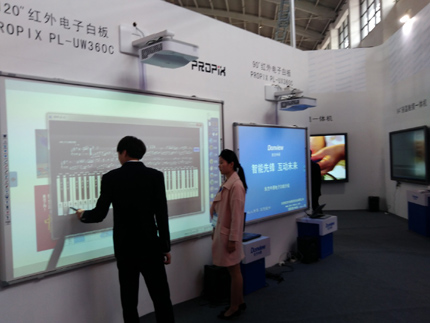 120寸電子白板擁有超大尺寸交互演示屏幕和6點(diǎn)觸控功能,在東方中原電子白板軟件及PROPIX(派克斯)激光投影機(jī)的支持下,簡單輕松的向教師提供了一個(gè)更寬闊更智能的大型的教學(xué)演示觸摸屏幕和人機(jī)交互的平臺(tái)。而以往要做到這點(diǎn),往往需要兩臺(tái)投影機(jī)加上兩臺(tái)電子白板及一臺(tái)價(jià)值不菲的融合器。東方中原大屏白板+激光投影機(jī)的解決方案,為高校階梯教室等大型教室、報(bào)告廳、會(huì)議室,提供了簡潔直觀有效的展示方式,受到現(xiàn)場教育工作者的青睞。
