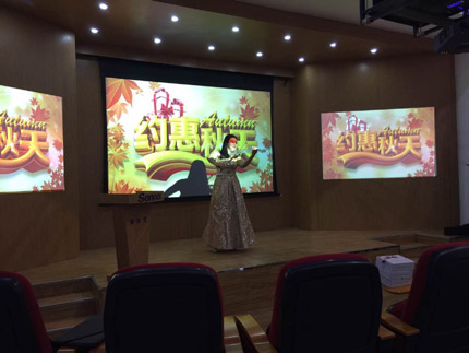 該展項通過模擬學校多功能廳的場景,體現投影設備在學校的多種應用。主屏采用2臺激光機(SNP-LU8500和SNP-LU7000)做雙機疊加顯示,設計兩種顯示模式,單可臺播放3D視頻,模擬影院,另可即時切換雙機疊加畫面,用于會議講座;輔屏各采用1臺SNP-LU6500,1臺配合松下視頻會議系統播放現場,一臺播放會議信息(如演講內容、工作匯報、活動視頻等),可用于學校師生會議、學生活動匯演、演講講座、畢業典禮等大型活動。