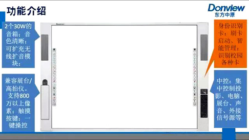 東方中原智能交互式白板一體機,不只是一塊普通的交互式電子白板,而是集交互式電子白板和液晶觸摸一體機兩者所有優(yōu)點于一體的智能交互式白板一體機。她既解決液晶一體機尺寸難做大和玻璃反光問題,又解決了白板不能高度集成的問題。更重要的是,還把中控、展臺、音箱等常用設(shè)備完美地結(jié)合到一起,既簡約大方,又功能齊備。這樣一款智能交互式白板一體機讓老師上課更加得心應(yīng)手。
