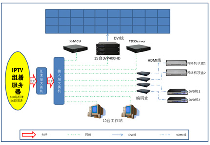 傳媒集團(tuán)新媒體中心管理著央視各頻道、全國(guó)各省衛(wèi)視頻道、廣東省、廣州市各地方頻道的IPTV電視節(jié)目在全省的網(wǎng)絡(luò)電視用戶(hù)中傳播。TV中心實(shí)際要接入中央電視臺(tái)各頻道、全國(guó)各省衛(wèi)視頻道、廣東廣州地方頻道等幾百路標(biāo)清、高清IPTV組播信號(hào),還有多路普清、超清手機(jī)電視組播信號(hào)。監(jiān)控中心的操作人員可以監(jiān)看到每一路IPTV信號(hào)音視頻是否正常,是否插播了不良廣告和反動(dòng)宣傳信息等等,從而保證節(jié)目的安全播出。