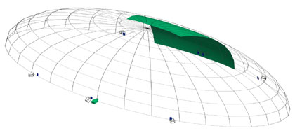 通過10+4的方式一共用14臺激光投影機打出天幕,其中10臺在穹形底邊四周對射,形成規則圓周帶,4臺打到穹形頂部,覆蓋沒有打到的區域,形成一個橢圓形半球體,橢圓和圓周帶疊加一部分作為羽化。見下圖所示: