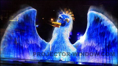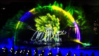 S+20K投影機(jī),在橫跨120余米的水幕舞臺(tái)上,根據(jù)舞臺(tái)風(fēng)格形狀進(jìn)行投影和圖像融合,影像可瞬間轉(zhuǎn)換,非常靈活;并配合數(shù)控升降系統(tǒng)對(duì)舞臺(tái)道具“月亮”進(jìn)行跟蹤投影,“月亮”徐徐升起,又徐徐降落,非常逼真。35000流明和20000流明的超高亮度投影,更是令創(chuàng)意影像在黑夜中噴薄而出。