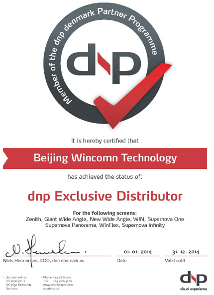 2014年1月,丹麥dnp向贏康正式頒發2014年度中國大陸地區獨家代理證書,將由贏康繼續負責dnp光學正投屏幕Supernova系列產品和光學背投屏幕Zenith、NWA、GWA等產品在中國大陸地區的市場、銷售和技術支持工作。作為全球最好的光學屏幕,dnp光學屏幕能在明亮環境下保持最佳的圖像對比度,提供符合人體工程學的明晰顯示解決方案,讓與會者告別黑暗、享受明亮的交流環境。
