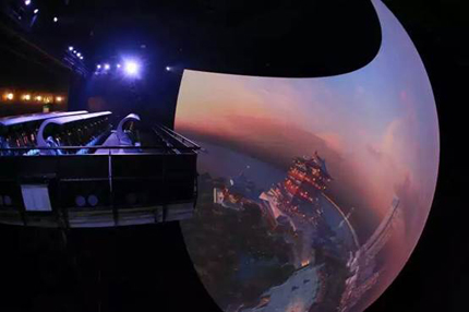 飛行影院乘騎設備采用Simetec懸空式6自由度動感平臺;球幕直徑20米,高度為15.8m;采用數臺科視4K分辨率35000流明高亮度投影機;數臺7thSense無損媒體播放器;17.1聲道擴聲系統;Alcron表演控制系統。