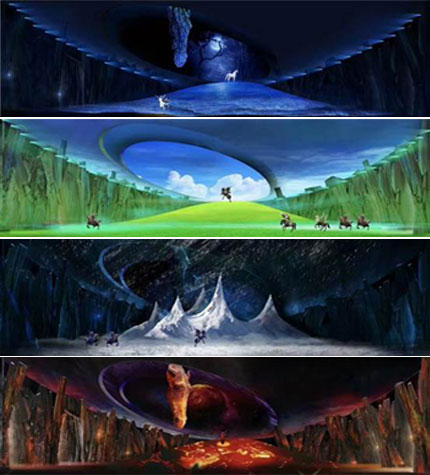 贏康設(shè)計(jì)的投影系統(tǒng)真實(shí)還原了草原、火山、沙地、雪地、日出、月落等自然場(chǎng)景。同時(shí),針對(duì)舞臺(tái)中央的馬頭建筑、雪山幕布等舞臺(tái)背景,單設(shè)了一組投影機(jī),配合布景的變化,投影機(jī)進(jìn)行靈活切換,讓布景與劇情充分融合,將整場(chǎng)表演推向高潮。
