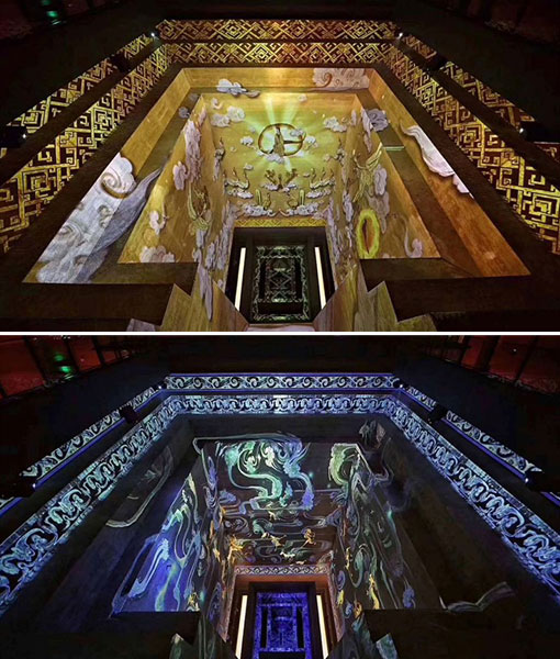 湖南省墓坑投影項目非常具有創新性和技術性,同時它也是國內首個墓坑投影應用。墓坑規模很大,南北長19.5米,東西寬17.8米,深達17米,且為倒錐形的墓坑建筑,不同于以往的地面上的建筑投影,這樣異形的載體使投影光路異常復雜,創意與墓坑層次結構嚴絲合縫的契合需要投影進行精準表現,畫面的表現力取決于片源的無損播放和真實的色彩還原。