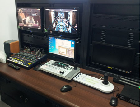 會議室的切換系統采用了SONY BRS-200特技切換臺和SONY BRC系列攝像機的完美組合,兩臺BRC-H700都通過添加SDI擴展輸出卡輸出數字高清SDI信號進入BRS200切換臺,將視頻信號完美對接,BRS200通過RS422控制信號,可同時控制2臺BRC-H700攝像機,將控制信號無縫連接,這樣就實現了一個人操作BRS200,可完成攝像機控制和視頻信號特技切換的兩項工作。司法局另一會場的SONY