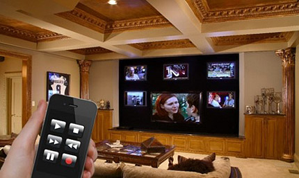 智能家庭影院,就是把智能家居控制功能加在了傳統家庭影院中,把家庭影音室內所有影音設備以及影院環境設備巧妙且完整地控制起來,以實現更加舒適、便捷、智能的家庭影院視聽與娛樂環境,和達到最佳的觀影,聽音樂,游戲娛樂的視聽效果。智能家庭影院通過一套智能家庭影院控制系統,不僅可以統一管理控制家庭影院室內的各種視聽影音設備,例如功放,音響,高清播放機,高清投影機,投影幕,高清電視等,還可以對影院室內各種空調,地暖,電動窗簾等環境控制設備進行實時控制。人們通過墻面的液晶控制面板,或智能手機、平板電腦等遙控技術,只要一鍵就能實現電影、音樂、游戲等各種情景模式的自由切換,讓觀賞者以最智能、快捷的方式達到想要的娛樂內容。