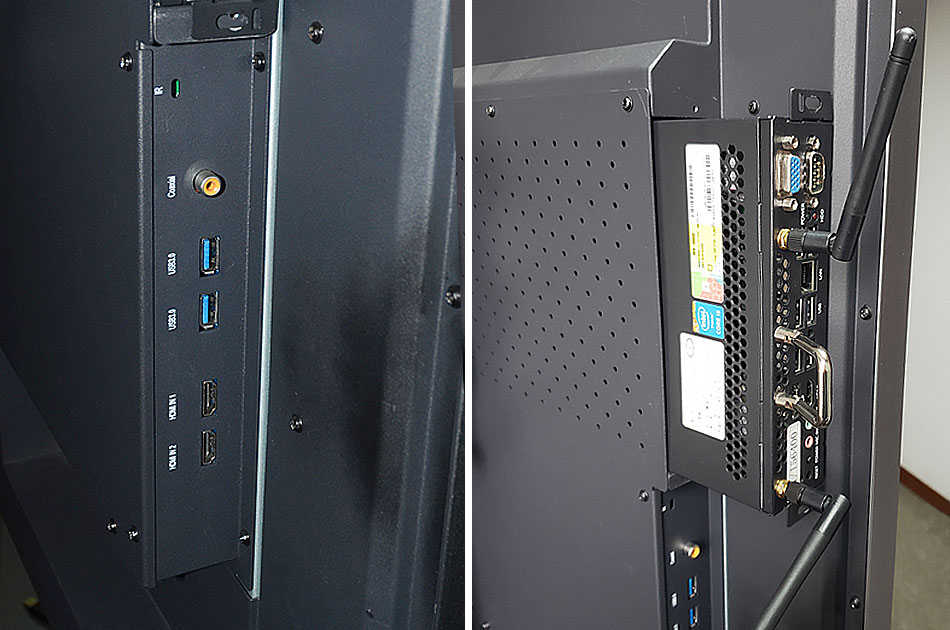 后置雙HDMI接口、USB接口等(左)、后置OPS插槽,可選配I5或者I7配置的高性能處理器(右)