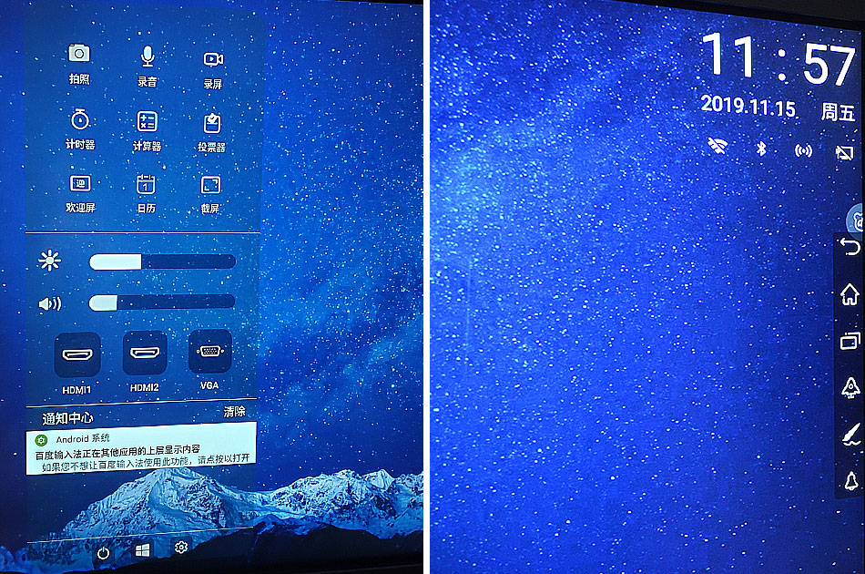 東方中原單獨設計的功能欄,將拍照、錄音、錄屏、計時器、計算器、投票器、歡迎屏、日歷、截屏功能單獨列出,還可以調節亮度、音量和選擇信號源。(左) 左右兩側隱藏著鏡像的一對菜單,可以隨時調出,進行回退、HOME功能、一鍵清理、批注等功能。(右)