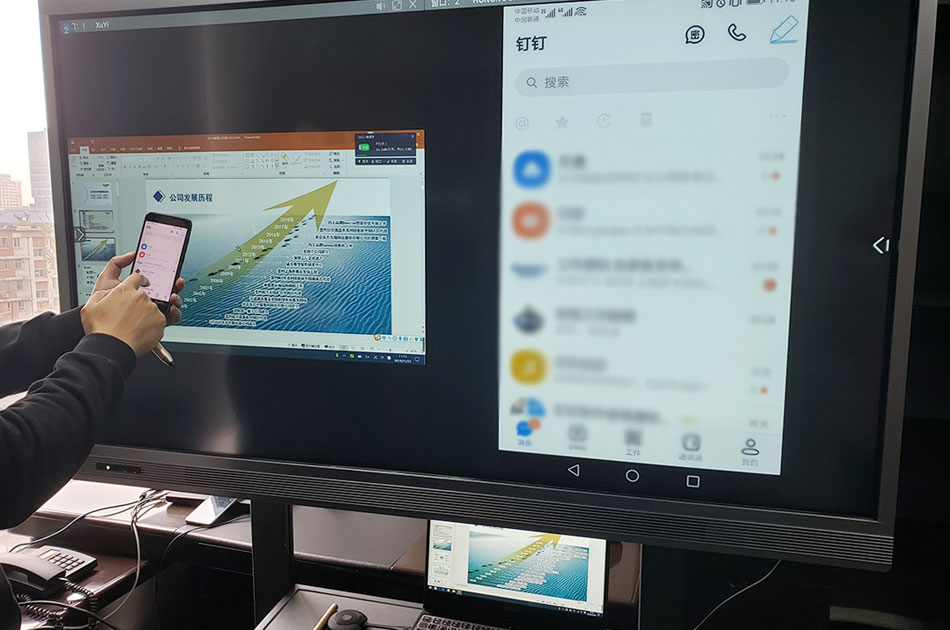 可以選購第三方合作的投屏器,接到筆記本上按一下投屏器按鈕就可以實現同步投屏,演講PPT之類的情況,演講者可以在智能會議平板上對筆記本進行反向操作、修改文檔,無需回到筆記本前操作。