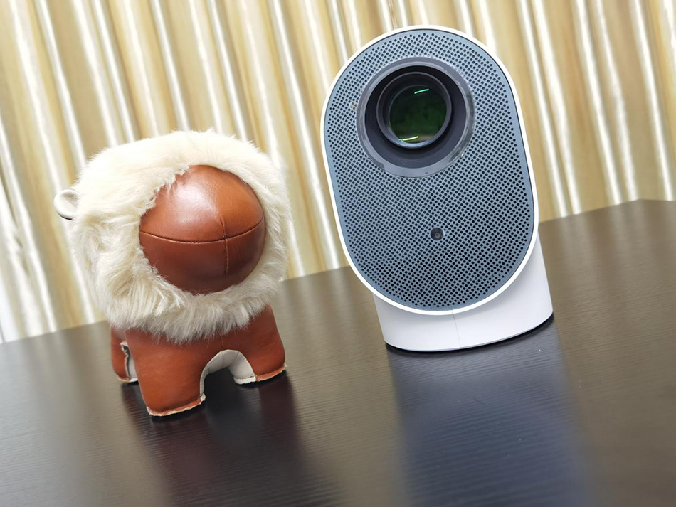 再看投影機本體,干凈整潔的配色不加任何多余的粉飾,小巧靈動的身形擺放于客廳之中絲毫不顯突兀。機身兩側與后方設有大面積的散熱孔,正面則為音響孔。同是投影產品,相比起標準的“電視盒子”,小明Q2的顏值可圈可點,靈活便攜的特性也讓其應用場景不止限于客廳、臥室,亦可帶至戶外,享受時下火熱的露營“星空影院”體驗。