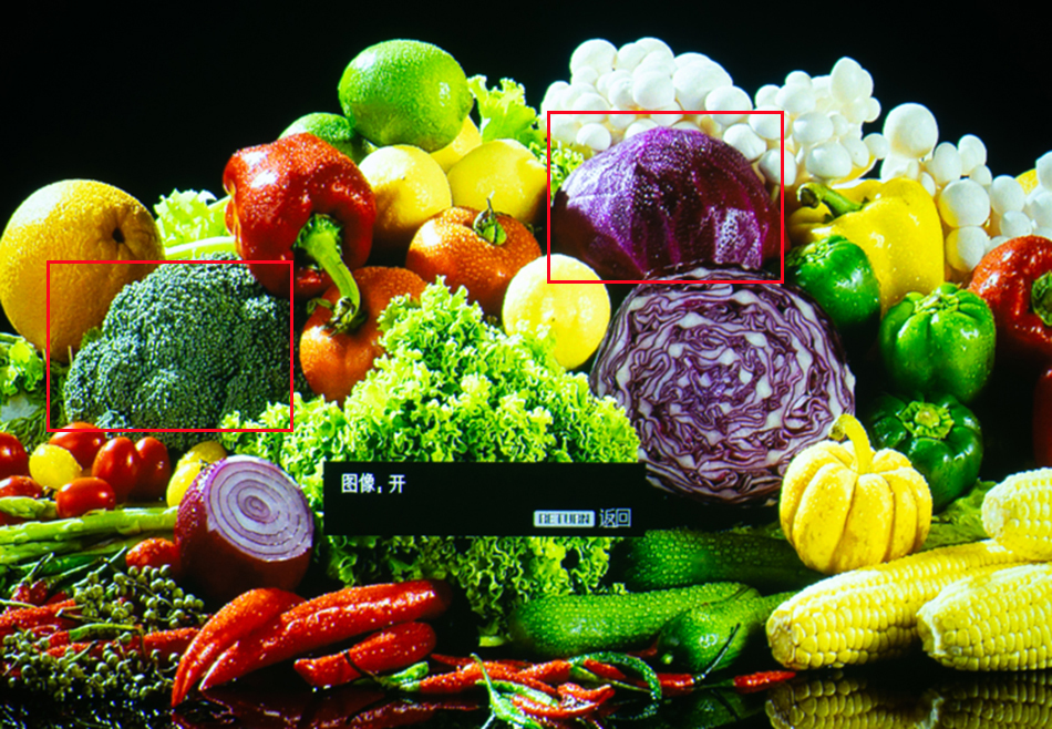 以上兩圖中,紫甘藍的水珠與反光、菜花的顆粒感與光澤對比非常顯著。