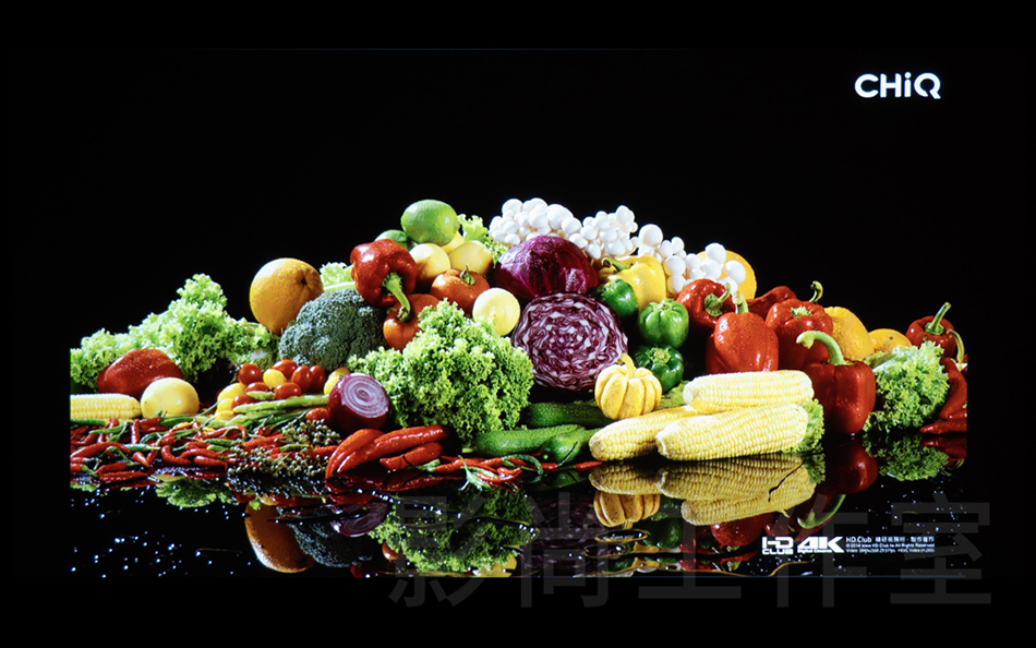 對比度測試畫面中,黑色背景非常低沉,而各種蔬菜的光澤和亮度則非常鮮明。