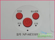 ME350X+ 為達到大氣美觀的效果采用耐磨耐臟中國紅按鍵,三個按鈕分別為信號源、自動調(diào)整以及開關(guān),其余功能需要靠遙控器來控制。