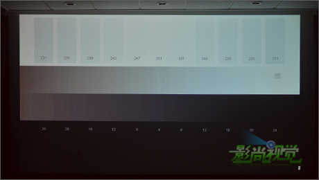 這張測試組合圖樣用來檢查投影畫面難以再現的極端灰度值,灰度范圍包含0—255。頂部灰度色條對于檢查白色飽和度和接近白色區域的色彩很有用,每個色塊之間的差值為白色的0.75%,范圍是94%-99%;底部的深色灰度對于檢查黑度和近黑色再現很有用,每個色塊之間的間隔為白色的1.5%,范圍是峰值白色的1.5%-12.5%。投影體驗時我們需要注意觀看每個色塊之間的變化。