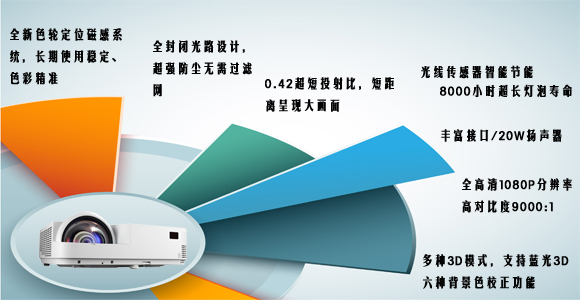 NEC此次推出的M323HS+家庭影院投影機,在各個方面都體現出了針對家庭應用的人性化設計。M323HS+采用了新一代磁感色輪定位系統,使家庭長期使用穩定、色彩精準;全封閉光路設計與超強防塵無需過濾網為用戶節省了更換過濾網的成本;而采用的8000小時超長壽命的新一代燈泡,又為用戶降低了后期維護的成本。在使用中M323HS+自身擁有強大過硬的配置,并支持多種3D模式,搭載20W大功率揚聲器,讓用戶在家中就能盡享影院級效果。下面,就請跟隨影尚視覺工作室一起來近距離接觸一下這款NEC