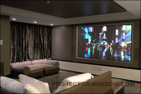 在投影機的亮度上,經計算最佳光通量應達到4500至5000流明的投影機為最好,同時采用特殊設計的幕布極為重要,要求幕布可將不同方向來的環境光不予理睬而對投影機來的光線有效反射,并做到色彩還原準確,高對比度,可視角大,等特點。最后決定用dnp的某型號正投幕,此產品在高亮度投影的激發下,可做到精準的色彩還原,120度的視角,7倍于普通幕布的對比度,2.0的增益。尤其是它基本克服了光斑效應(注;大部分高增益幕,在使用時,幕面有亮斑,隨你視角移動而移動。)(配圖8)。至此我們完全解決了所有問題為客戶達成心愿。 |