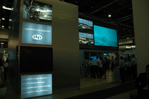 China 展覽會。展出dnp 巨型廣角屏幕™ 電視舞臺版產品。電視舞臺版的dnp巨型廣角屏幕™ 是專為電視臺的演播室及舞臺而設計的嶄新屏幕。任何一般的屏幕在強烈的環境燈光下所顯示的圖像都會被強光所“沖淡”,但這嶄新的屏幕卻能在這種環境下發揮清晰亮麗,卓越的對比度而顯示出高分辨的圖像。而且200英寸的屏幕尺寸正適合大多數的電視臺演播室及舞臺的需要,并讓屏幕將來能夠更完美地顯示高清晰電視(HDTV)。同時展出dnp 加固型超對比屏幕™