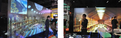 展臺主屏是15塊DLP背投拼接組成的顯示墻物聯網拼接的大屏幕顯示系統。屏幕的色彩、亮度和畫面即時切換的效果非常好,大屏上是點對點展示的超高分底圖,實現這一功能的設備是“TNet超高分底圖機”。