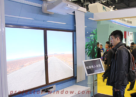 日立超短焦投影機配合體感互動設備搭建的體驗區,隨著觀察者前后左右移動,“窗口”中的景物也會發生變化。