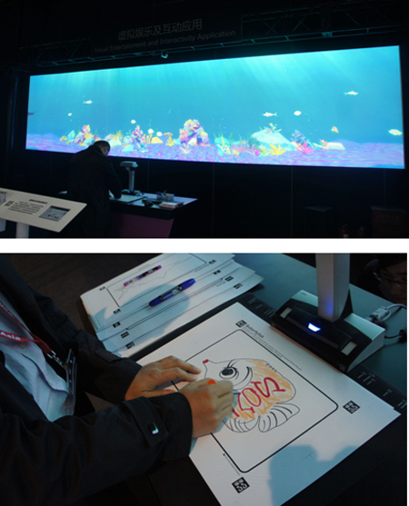 本區域采用3臺7000流明激光光源投影機VPL-F725HZL,憑借其內置的邊緣融合功能,創建一個無縫統一的大畫面。而本展區的亮點不僅僅來自精美的畫面顯示效果,更來其展示的內容——無水數字DIY水族館。該區域通過投影畫面營造一個水族館的虛擬場景,觀眾除了可以看到常規的數字海洋世界外,還可以通過手繪的方式將自己創作的海洋生物通過掃描系統進行上傳,結合預設的各種海洋生物的生活習性,最終將觀眾的作品栩栩如生地呈現在數字水族館中。現場還準備了各種海洋生物的手繪模板,輔助觀眾創作。整個展區成為了激發觀眾好奇心及創作欲望的樂園,人們紛紛將自己的作品“投入”到虛擬水族館中,現場氣氛熱烈而愉快。