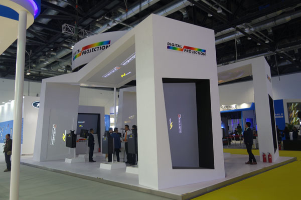 DP這次展位的主視覺依然選擇開放式的布局,白色展板給人清爽的感覺,不規則的架構和縱橫交錯的畫面則體現了投影應用的靈活性。
