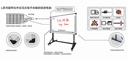 印天L系列超窄紅外電子白板,采用紅外感應技術,無需專用筆,手指、教鞭即可直接操作,多重觸摸,互動性強;同時,它是一款專為教學設計的電子白板,邊框僅為40mm,實現(xiàn)書寫面積最大化;并且,抽拉式主板及PCB串行總線技術的應用,使其在安裝、使用和維護方面都很簡單方便。