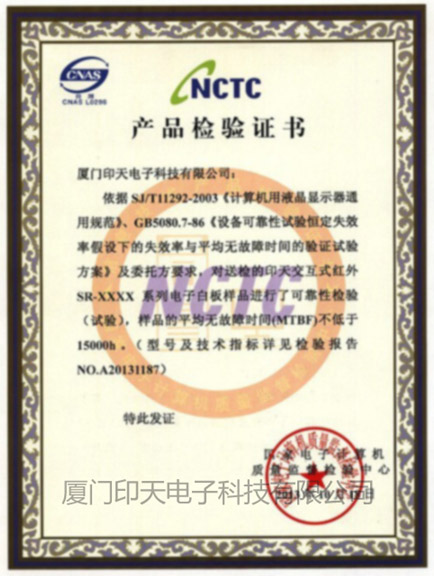 近日,印天紅外電子白板,順利通過國家電子計算機質量監督檢驗中心MTBF測試,平均無故障工作時間達到15000小時!