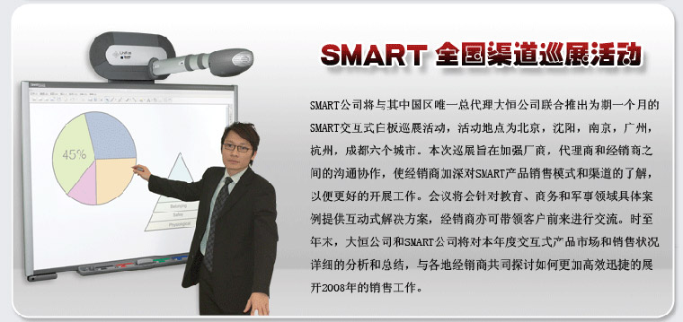 SMART技術公司是簡便易用的交互式白板和其它分組協作工具的行業先鋒和全球市場領導者。SMART產品包括屢屢獲獎的SMART交互式智能白板,交互式筆顯示屏、交互式數字覆寫屏、無線書寫輸入設備及其軟件。利用SMART產品,工作小組可以看到并分享會談、教學、培訓和演示的信息。