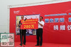 2008年9月19日,身處四川地震災(zāi)區(qū)的孩子們迎來了最令他們感動(dòng)的新學(xué)期開學(xué)禮物。地處德陽市天元工業(yè)集中開發(fā)區(qū)內(nèi)的東汽中學(xué)臨時(shí)校舍的操場(chǎng)上,來自加拿大的SMART技術(shù)公司正在向?yàn)?zāi)區(qū)學(xué)校無償捐贈(zèng)價(jià)值280萬元的交互式白板,以幫助這些學(xué)校打造現(xiàn)代化多媒體教室。