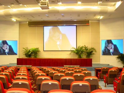 會議或類似功能的場所,顯示設(shè)備主要用于顯示播放視頻、現(xiàn)場攝像、發(fā)言提綱等。對于有主席臺并且發(fā)言人位于主席臺中部的會場,顯示設(shè)備通常有位于主席臺正中的大屏幕顯示和主席臺兩側(cè)的中、小屏幕顯示器;中間的大屏幕以顯示播放視頻為主,現(xiàn)場攝取的發(fā)言人形象和發(fā)言提綱則由兩側(cè)的中、小屏幕顯示。