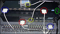 CR-UART8與設備的連接比較簡單,我們以PGMII中控連接CR-UART8來控制8*8AV矩陣為例來說明。首先是PGMII的其中一個串口(例如是第一個串口COM1)連接到CR-UART8后面板的輸入COM口,如下圖紅色圈所圈起的位置。接著是CR-UART8的其中一個串口(例如是第一個串口COM1)連接到8*8AV矩陣上,如下圖藍色圈所圈起的位置。CR-UART8分配器需要額外連接一個12V的外接電源,如下圖綠色圈所圈起的位置。最后是無線接受器連接PGMII中控,如下圖黃色圈所圈起的位置。