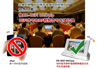 CREATOR快捷CR-WIFI WG7pip專門設計了WIFI和RF射頻控制方式自由切換功能,在WIFI信號受到干擾時,可以馬上無縫切換到RF射頻進行通訊,給您的會議提供雙重保障。