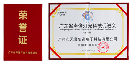 2014年1月,廣州市天譽創高電子科技有限公司憑著領先的中央控制系統、矩陣系統、智能會議系統等高端產品的高新技術當選廣東省聲像燈光科技促進會第一屆副會長單位。廣州市天譽創高電子科技有限公司總經理王國孟先生出任廣東省聲像燈光科技促進會第一屆副會長。 |