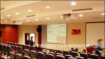3M多功能會議報告廳面積為200多平方米,平面外形近似于圓形。由大屏幕視頻顯示、會議擴聲、信號切換和集中控制四大部分組成。根據3M公司要求,整個報告廳要能夠進行視頻會議,培訓,職工大會等不同用途的會議,不同功能之間的變換要迅速可靠。其中投影系統使用2臺3M投影機和電動幕。擴聲使用了BIAMP的數字信號處理器。視頻會議運用Polycom視頻會議系統。信號切換使用ITRON的AV和VGA矩陣。整個報告廳設有主席臺和觀眾席兩部分。由于采用的設備多,功能變化大,3M特別強調操作要簡便,系統穩定性要高。